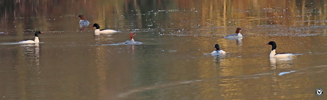 A Grey Heron flew in and landed with little grace in a small patch of reeds. The Herons arrival caused great consternation among the Goosanders who became increasingly agitated and then, as one, took to the air and flew low and hard along the waters surface and away back towards the carpark end of the pool. If I hadn't have been looking elsewhere then I might have gained some nice flight shots. We retraced our steps back but there was no sign of the Goosanders so they must have flown out to another water body nearby.