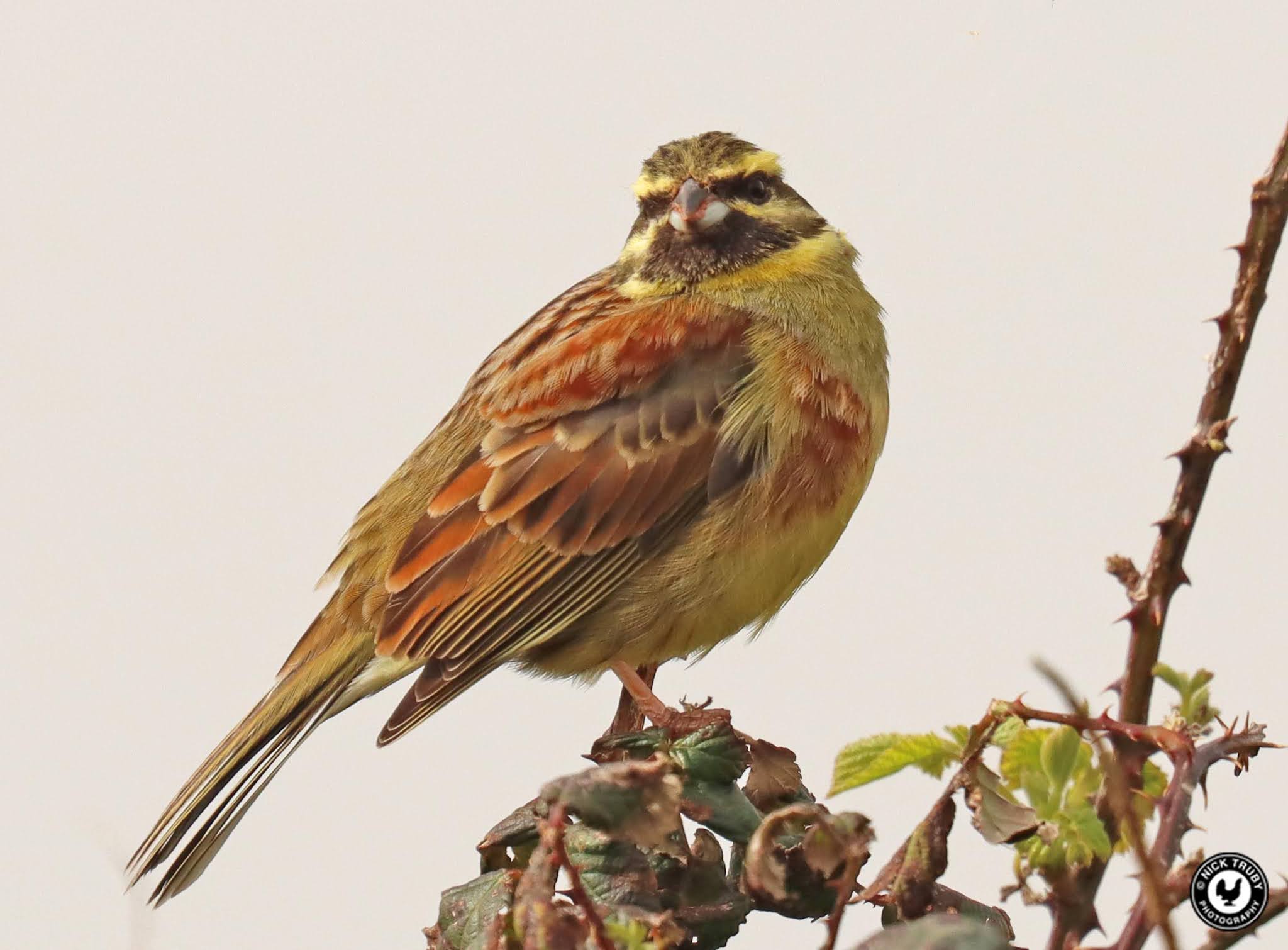 Our unwelcome friend had gone, thankfully, so we looked along the field edges again but there was no further sign of any of the Cirl Buntings that we'd found before although plenty of Linnets remained. We had got our year tick, the 135th of a tricky 2021, so were happy enough to move on. As we walked slowly between the hedges I heard another Cirl Bunting singing. I swung around and spotted the bird right at the top of a bramble patch close to the tree where the one had been before.