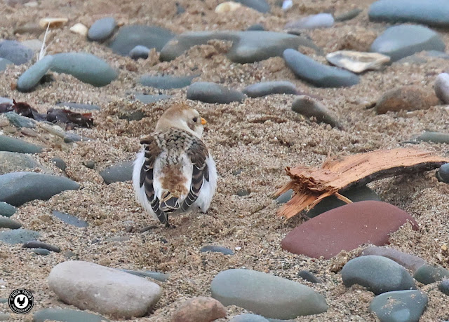 Snow Buntings are beautiful little birds to see, whether in their breeding finery on a Scottish Mountain top in lovely sunshine, or surviving the winter on a desolate beach in Fleetwood on a dreary grey day, so we were more than happy to re-find this one. Wherever they are, Snow Buntings ooze character and are relatively tolerant of humans so it's not too difficult to get some decent photos of them.
